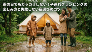 雨の子連れグランピング、キャンセルすべき?「雨予報で最悪…」を最高の思い出に変える対策ガイド。子供が飽きない遊びのアイデアや、雨天に強い宿選びの3条件、追加すべき持ち物を徹底解説。高滝湖やるり渓など雨でも楽しめる厳選宿も紹介します。この記事を読めば、雨の日が家族の特別な休日に変わります!